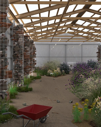 An existing shed is repurposed into a waste depository, where waste can be catalogued and reused by the community. The nursery facilitates the propagation of threatened plant species, where indigenous-led caring for Country ecological interventions can be implemented across the site. The communal shelter is built around the existing power line- where remnant vegetation is found to be growing around. This structure is designed as a more open-ended space for the community to appropriate for gatherings, which could be BYO bar or a semi-enclosed cinema.The verandah that is offset from and wraps around the existing power line hopefully encourages occupants to pause, reflect and observe for signs of life in their natural environment.